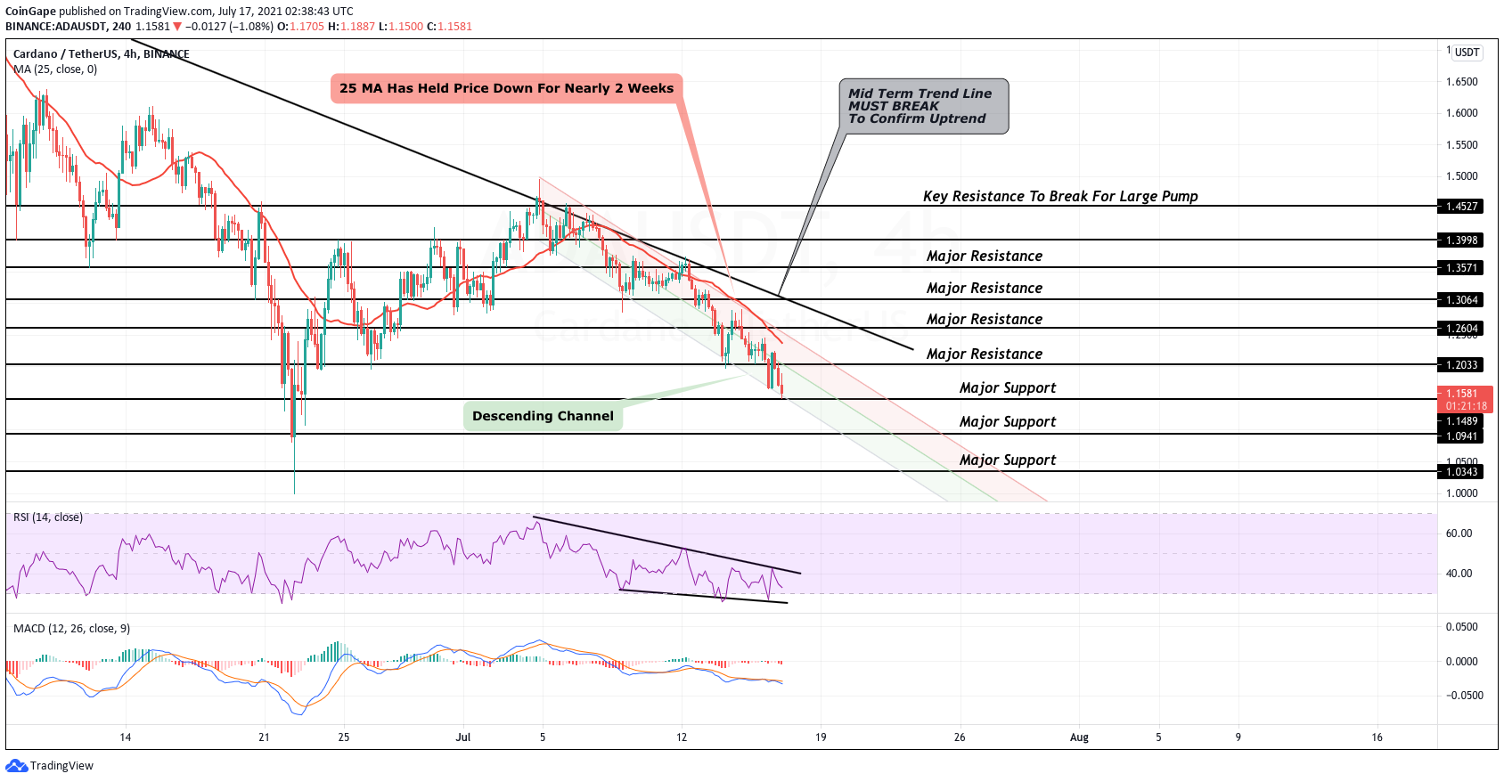 قیمت ADA از 5 جولای(14تیر) در داخل یک کانال نزولی گیر کرده است . قیمت بعد از هر برخورد با خط روند به شدت به سمت پایین رفته است چرا که به نظر نمی رسد روند نزولی شکسته شود. در زمان انتشار این مطلب، قیمت ADA به حمایت مهم خود در 1.15 دلار رسیده که باعث شده سایه کوتاهی تا آن محدوده تشکیل شود. اگر گاوهای ADA موفق به ایجاد افزایش قیمت قوی نشوند، ما قیمت زیر $1.10 را بسیار سریع خواهیم دید.