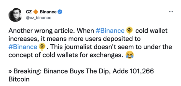 بر اساس توییت اخیر مدیر عامل بایننس، CZ، این صرافی صرفاً دارایی های بیت کوین خود را به کیف پول سرد منتقل کرده زیرا کاربران بیشتری بیت کوین را در بایننس خریداری میکردند. مسلماً، سرمایهگذاران کریپتو در طول رکود داراییهای بیشتری را انباشته میکنند، و این ممکن است زمانی اتفاق بیفتد که بیت کوین در آخر هفته به کمتر از ۲۰ و ۱۹ هزار دلار سقوط کرد.