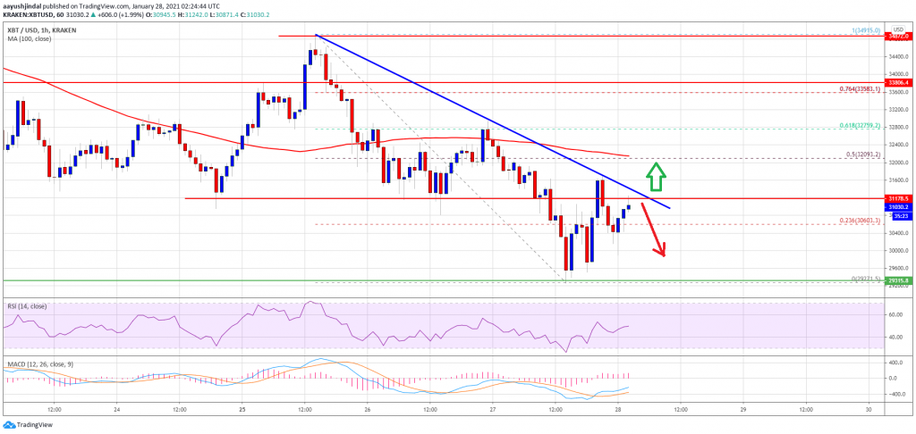 بیت کوین به زیر 31000 و 30000 دلار کاهش یافت و هم اکنون در حال اصلاح در سطوح بالاتر است و به نظر می رسد که گاوها قصد دارند یک شکست بالاتر از 32000 دلار ایجاد کنند.
