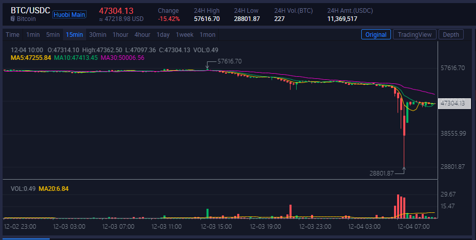 با این حال، سایر محلهای معاملاتی شاهد کاهش شدید قیمتها بودند. این مورد در مورد جفت معاملاتی BTC/USDC در Huobi صادق بود که بیت کوین تا 28801 دلار کاهش یافت، همانطور که تصویر زیر نشان می دهد.