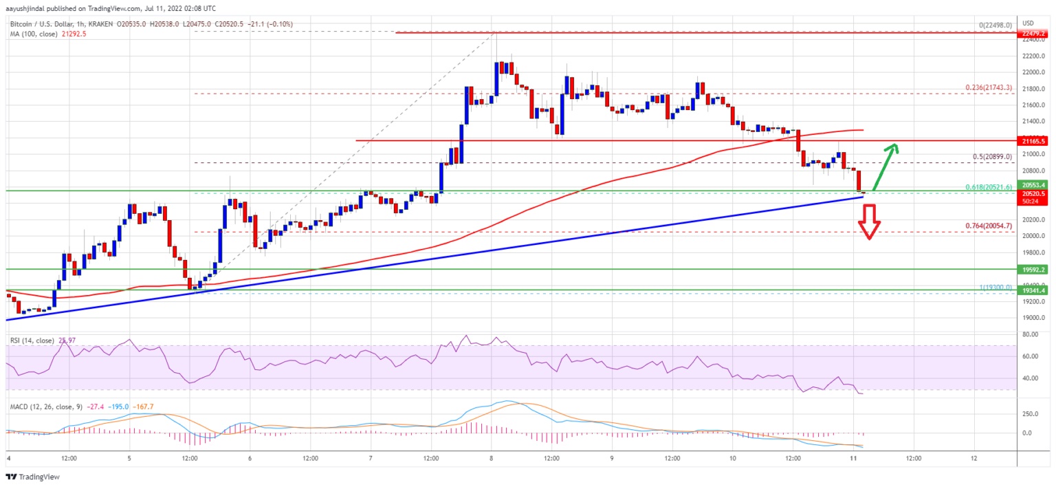 اندکی پایین تر، در نزدیکی تراز 20500 دلار، حمایتی کلیدی وجود دارد. در نمودار ساعتی جفت ارز BTC/USD نیز یک خط روند صعودی اصلی با حمایتی نزدیک به 20520 دلار در حال شکل گیری است.