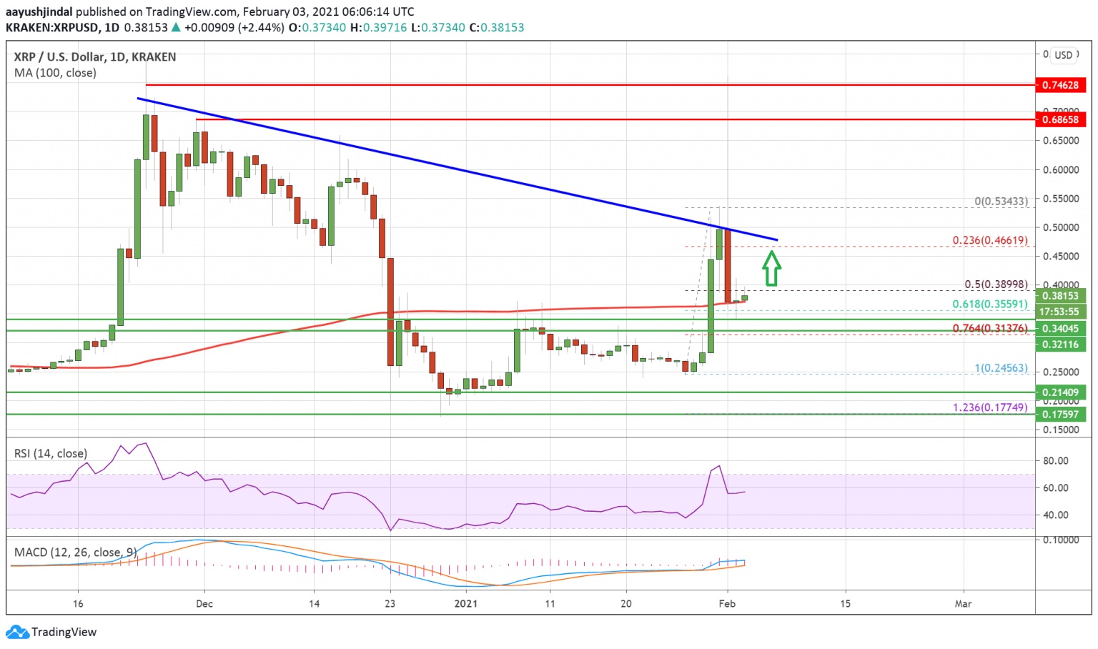پس از شکست قیمت بالاتر از سطح 0.3200 دلار ، قیمت ریپل (XRP) با یک افزایش شدید روبرو شد. قیمت این ارز مشخصاً بالاتر از منطقه مقاومت 0.4000 و سطح 0.5000 شکسته شد.