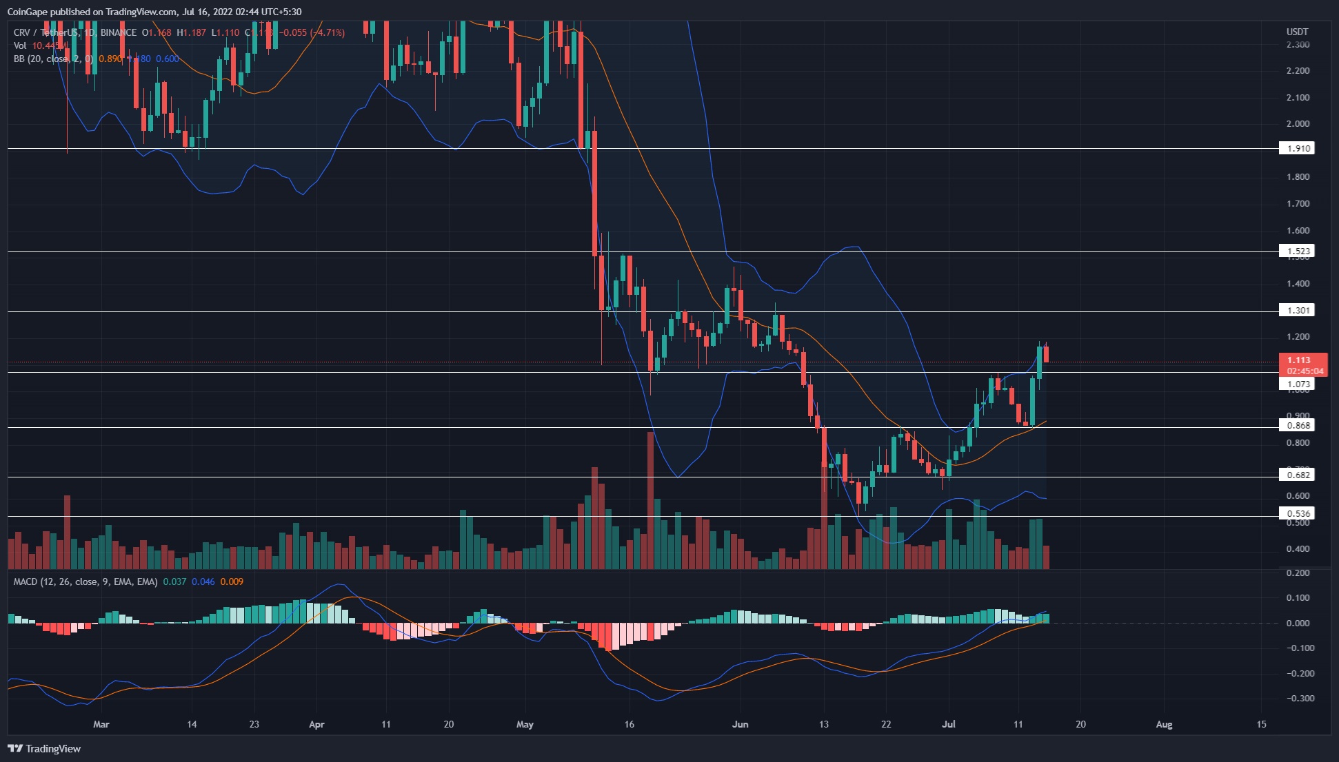 برای نزدیک به یک ماه، جفت ارز CRV/USDT به طور پیوسته با تشکیل سقف ها و کف های بالاتر در مسیر افزایش قرار گرفت، به طوری که قیمت آن از 0.536 دلار بازگشت و با حدود 108 درصد رشد، در حال حاضر با قیمتی در حدود 1.12 دلار معامله می شود. روز 14 جولای (23 تیر)، قیمت CRV همزمان با یک پامپ قابل توجه در حجم معاملات، از مقاومت روانی 1 دلار گذشت.