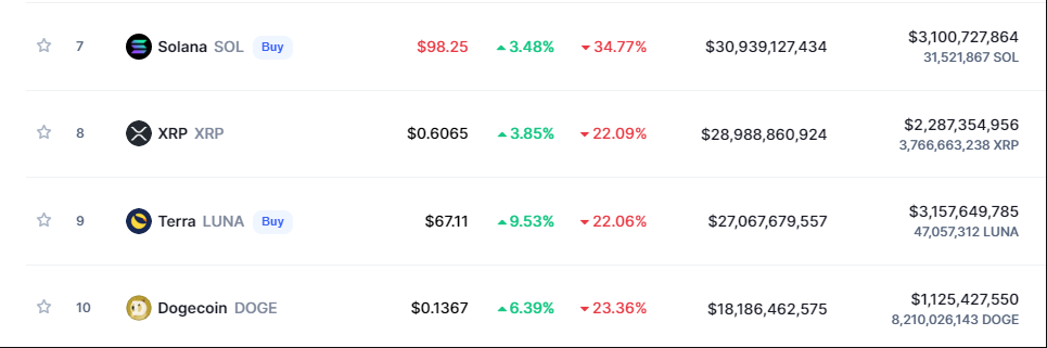 همانطور که توسط U.Today گزارش شده است، Dogecoin در اوایل دسامبر 2021(اواسط آذر) از 10 رمزارز برتر خارج شد. Terra (LUNA) جایگاه آن را تصاحب کرد. Terra در جایگاه نهم باقی مانده است و در زمان نگارش با قیمت 67 دلار معامله می شود.