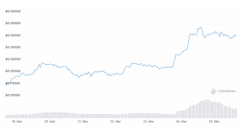 در پایان هفته ای که شاهد رشد بیش از ۱۵ درصدی دوج کوین بودیم، این رمزارز شروع به ریزش کرد و در پایان طی ۲۴ ساعت گذشته با ۳ درصد کاهش قیمت روبرو شده است. اما اکنون وضعیت آن تثبیت شده و شروع به بهبود کرده است. تجزیه و تحلیلهای CoinGecko نشان میدهند که اگرچه دوج ممکن است رشد زیادی نداشته باشد، اما به نظر میرسد که در حال تثبیت دستاوردهای حاصل از ۲۳ مارس (۳ فروردین) است. پس از کاهش به ۰/۱۳۴۷۳۷ دلار، دوج اکنون به ۰/۱۳۴۴۹ دلار بازگشته است.