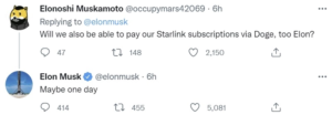علاوه بر این، ماسک گفت که اشتراک استارلینک اسپیسکس ممکن است «یک روزی» با دوج کوین قبال پرداخت باشد. وب سایت این شرکت توضیح می دهد که استارلینک «اینترنت پهن باند پرسرعت و کم تاخیر را حتی در نقاط دورافتاده و روستایی در سراسر جهان» ارائه می دهد.