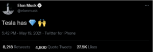 ایلان ماسک ، مدیر عامل تسلا ، بار دیگر در توئیتر خود به نگرانی کسانی که تصور می کردند تسلا قصد دارد از بیت کوین خارج شود، پایان داد. ایلان ماسک از طریق شکلک ها توئیت کرد که تسلا ” در دستان خود الماس” دارد.