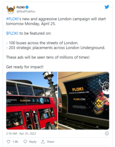 فلوکی اینو کمپین جدید را در 23 آوریل(3 اردیبهشت) اعلام کرد و اشاره کرد که “رمزارز مردمی” از دوشنبه 25 آوریل(5 اردیبهشت) تبلیغات را در کنار 100 اتوبوس و روی 203 پوستر در ایستگاه های قطار زیرزمینی شهر آغاز می کند.