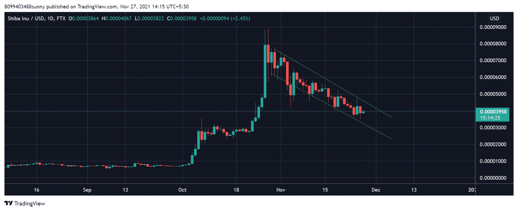 همانطور که از نمودار یک روزه مشخص است، آلتکوین در طول ماه نوامبر شاهد افت قیمتی مداوم بوده است. قیمت SHIB در حال حاضر در یک کانال نزولی در نمودار قیمت یک روزه در حال حرکت است و اعلام اخیر متاورس می تواند به ارز میم کمک کند تا پس از نزدیک به چهار هفته حرکت نزولی، یک شکست صعودی داشته باشد.