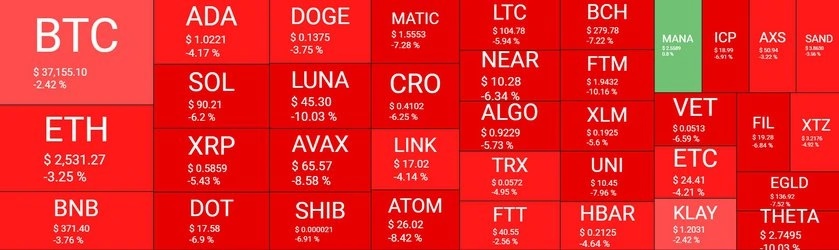 با این حال، سولانا، ریپل، پولکادات، ترا، اوالانچ، شیبا اینو، MATIC و CRO افت قیمت قابل توجهی را تجربه کرده اند. Terra با کاهش دو رقمی به 45 دلار رسیده و دوباره بیشترین ضرر را در بین رمزارزهای بزرگ بازار داشته است. در این میان، دسنترالند تنها رمزارز سبزپوش امروز با رشدی در حدود 1.44% روبرو شده است. در حال حاضر MANA با قیمت 2.58 دلار ترید می شود.