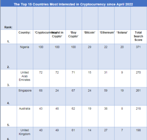 پس از سقوط بازار رمزارزها در ماه آوریل (فروردین)، یک مطالعه جدید نشان داد که نیجریه رتبه اول را در میان کشورهای انگلیسی زبانی دارد که بیشترین علاقه را به رمزارزها دارند. بر اساس یافته های مطالعه انجام شده توسط Coingecko، امتیاز نیجریه 371 می باشد که از رتبه های دوم و سوم، یعنی امارات متحده عربی با 101 و سنگاپور با 110 امتیاز، بیشتر است.