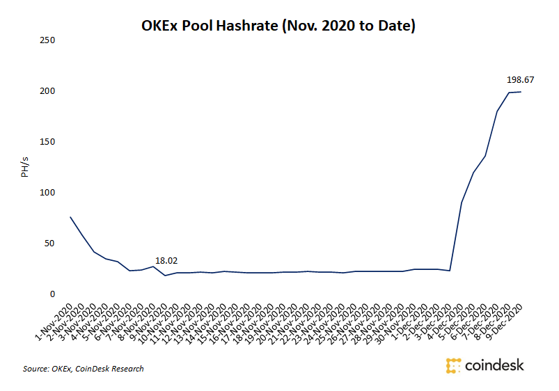 اگرچه، هنوز هم به میزان قابل توجهی در زیر سطح هشریت قبلی خود قرار دارد، با این حال، هشریت استخر OKEx به 198.67 PH/s با ضریب 11 نسبت به پایینترین مقدار خود در ماه نوامبر به میزان 18 PH/s، افزایش یافت.