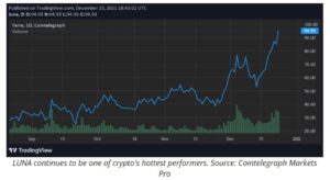 طبق گزارش Cointelegraph Markets Pro، قیمت LUNA، کوین Terra نیز به طور پیوسته روند صعودی دارد و بالای 94 دلار با 31 درصد افزایش در یک هفته معامله می شود. این کوین اکنون دارای ارزش کل بازار 34.8 میلیارد دلار است که آن را در 10 پروژه برتر ارزهای دیجیتال قرار می دهد.