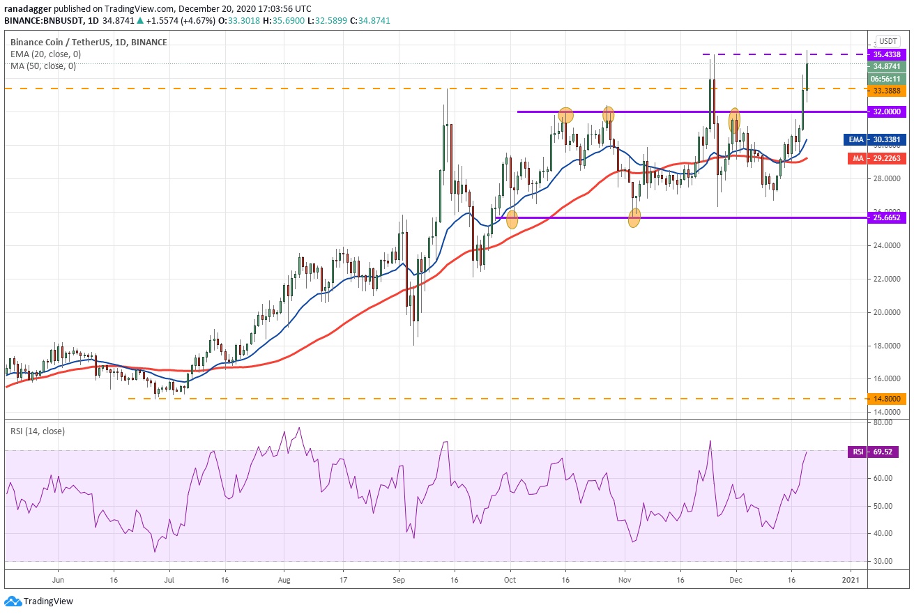 نمودار 4 ساعته جفت ارز BNB/USD نشان می دهد که گاوها قیمت را به سطوح بالاتر از مقاومت بالاسری هدایت کرده اند اما در حفظ سطوح بالاتر ناکام مانده اند. این نشان می دهد که خرس ها با قدرت از سطح 35.4338 دلار دفاع می کنند.