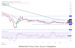 دیسنترالند (MANA) طی چند روز گذشته نتوانسته است از میانگین متحرک نمایی 20 روزه (1.06 دلار) عبور کند. اگر گاوها قیمت را به بالاتر از میانگین متحرک نمایی 20 روزه برسانند، نشان می دهد که خرس ها قدرت خود را از دست می دهند. سپس جفت ارز MANA/USDT می تواند تا مقاومت در 1.36 دلار افزایش یابد. این سطح مهمی است که باید مراقب آن بود، زیرا شکستن و بسته شدن بالای آن میتواند نشاندهنده کف باشد و سپس این جفت ارز می تواند تا 1.68 دلار افزایش یابد.
