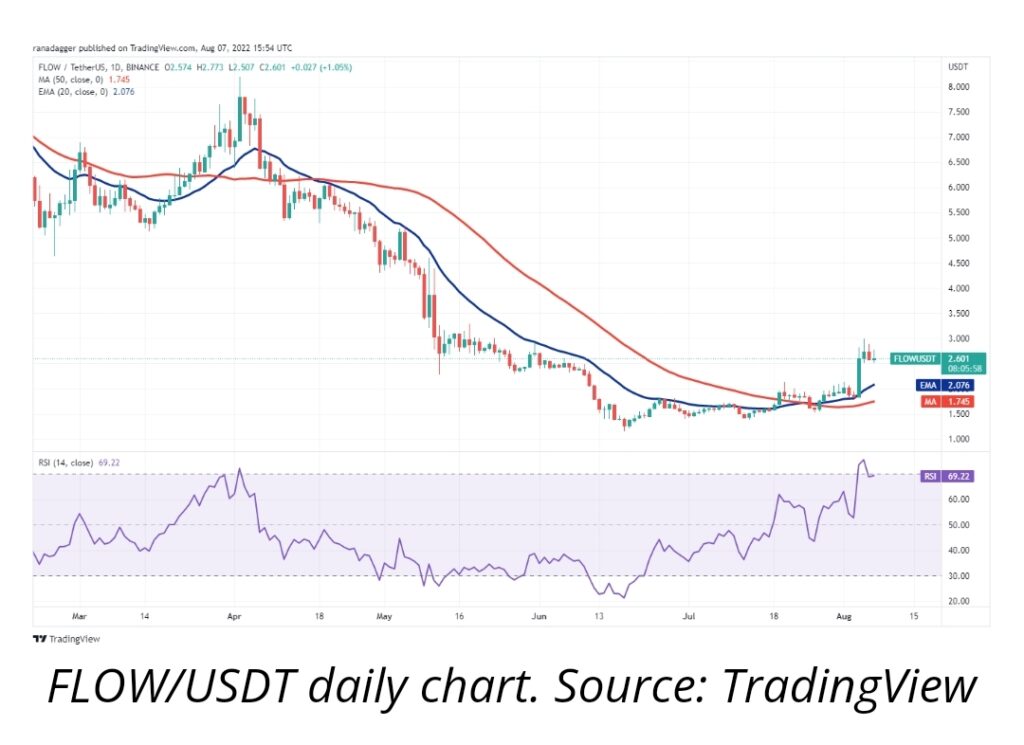 متحرک نمایی 20 روزه (2.07 دلار) شروع به افزایش کرده است و RSI نزدیک به منطقه خرید بیش از حد است که نشان می دهد گاوها قدرت بیشتری دارند. اگر خریداران قیمت را به بالای محدوده مقاومت 3 تا 3.30 دلار برسانند، جفت ارز FLOW/USDT میتواند شتاب بیشتری بگیرد و به سمت 4.60 دلار افزایش یابد.