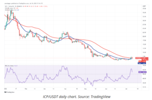 اینترنت کامپیوتر (ICP) در 8 جولای (17 تیر)به بالاتر از SMA 50 روزه (6.48 دلار) رسید، که نشان می دهد گاوها در تلاش برای تشکیل یک کف هستند. میانگین متحرک به تکمیل یک کراس اوور صعودی نزدیک است و RSI در منطقه مثبت قرار دارد، که نشان می دهد خرس ها ممکن است قدرت خود را از دست بدهند.