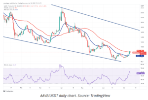 ریکاوری AAVE در 9 جولای(18 تیر) به بالاتر از SMA 50 روزه (79 دلار) رسید که نشان دهنده تغییر احتمالی روند است. متحرک نمایی 20 روزه (68 دلار) شروع به افزایش کرده است و RSI در منطقه مثبت قرار دارد، که نشان می دهد گاوها در تلاش برای بدست آوردن قدرت هستند.