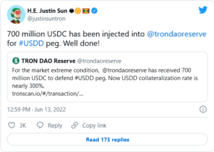 در میان ریزش فعلی بازار، ترون دائو به اشتراک گذاشت که 700 میلیون USDC (نزدیک به 700 میلیون دلار ارزش) برای دفاع از ثبات USDD به ترون دائو تزریق شده است. همچنین در توییتی اعلام شد که 100 میلیون دلار USDC دیگر برای خرید TRX بیشتر به بایننس سپرده گذاری شده است.
